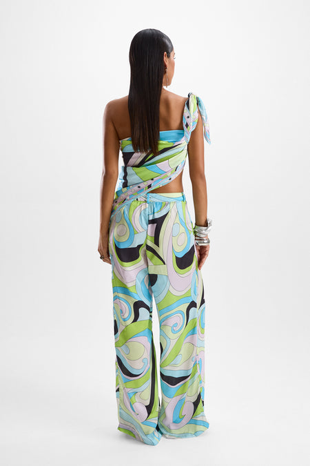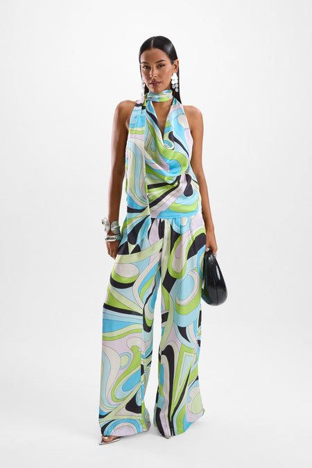 A constellation of shapes formed in a kaleidoscope of color, create the retrofuturistic print dreamed up from planets afar.