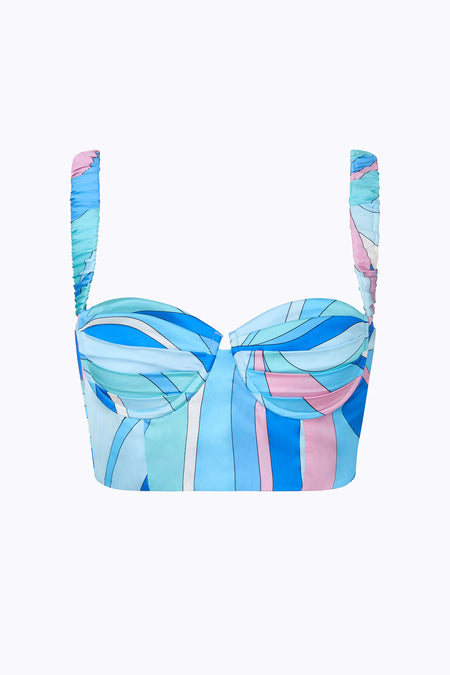 Dolce Blue features cool blues and soft pastels with fluid, swirling patterns, evoking a vibrant seventies jet set vibe.