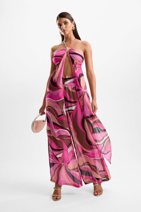 Dolce Pink features cool berry hues and rich browns in fluid, swirling patterns, evoking a vibrant seventies jet set vibe.