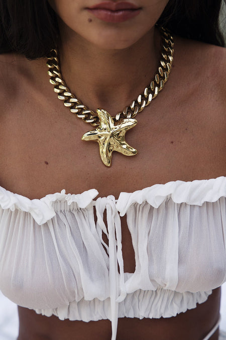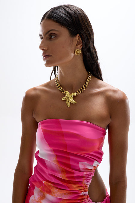 Strong yet sexy, the Bond swimsuit features striking gold buckle hardware and a backless cut.