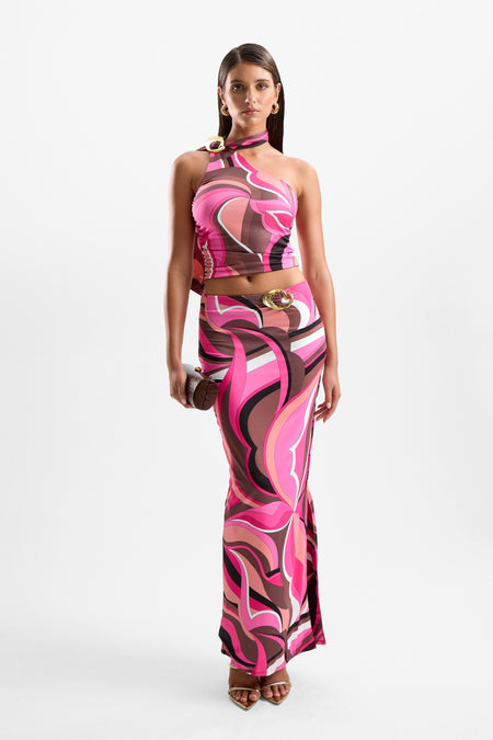 The flattering asymetric neckline of the 'Cosmos' top meets old school glamour with a neck scarf detail.
