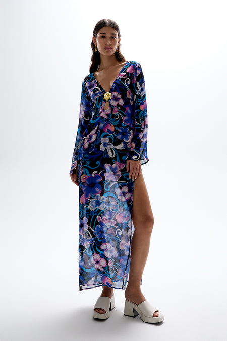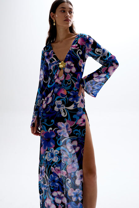 A tropical nightscape of blooming florals and ombre elements dance together in our blue Hibiscus print from the 'Ablaze' Resort '24 collection.