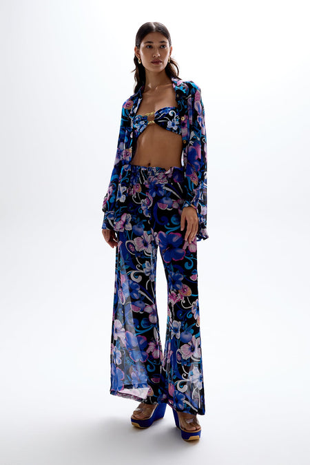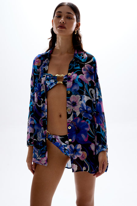 A tropical nightscape of blooming florals and ombre elements dance together in our blue Hibiscus print from the 'Ablaze' Resort '24 collection.