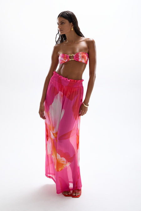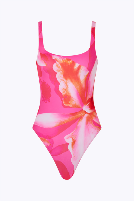 The watercolor inspired canvas of the 'Wildflower' print is doused in electric pink and features the raw beauty of the Orchid flower.